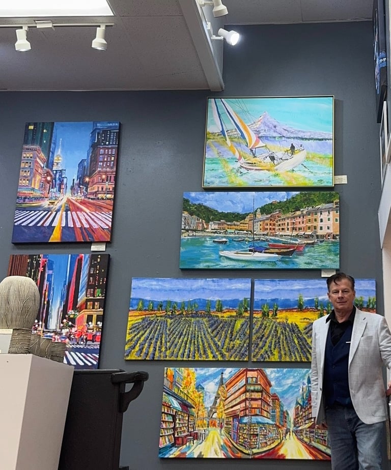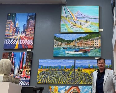 Blending impressionism with architecture, I use diverse tools—palette knives, rollers, spatulas—to shape layered, textured paintings inspired by cityscapes and nature.